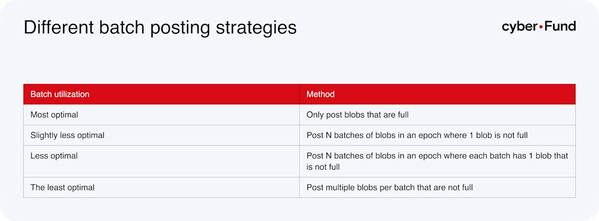 After that. the next optimal data utilization is when all blobs in an epoch posted by a rollup except one are full. This ensures that all transactions are secured by Ethereum as frequently as possible while also optimizing the data utilization of a rollup. No major rollup is utilizing such data optimization.