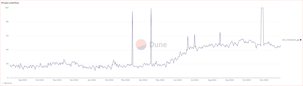 In addition to bundles extracting MEV or transactions trying to avoid being victims of MEV extraction private transactions can also be sent due to an exclusive order flow agreement between a builder and transaction sender. For example, Bananagun bot and Titan builder used to have an agreement where Bananagun bot would only send their transactions to Titan. This results in an information asymmetry between builders with exclusive orders and other builders which results in a competitive advantage for the builder with information advantage.