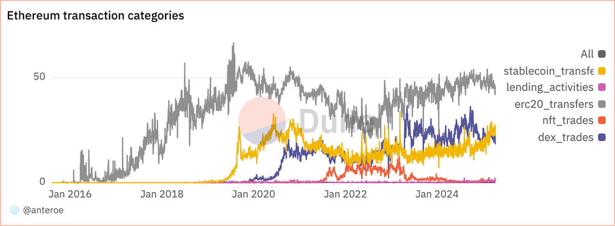 Percentage of all transactions for different transaction categories over time on Ethereum