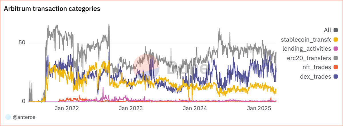 Percentage of all transactions for different transaction categories over time on Arbitrum
