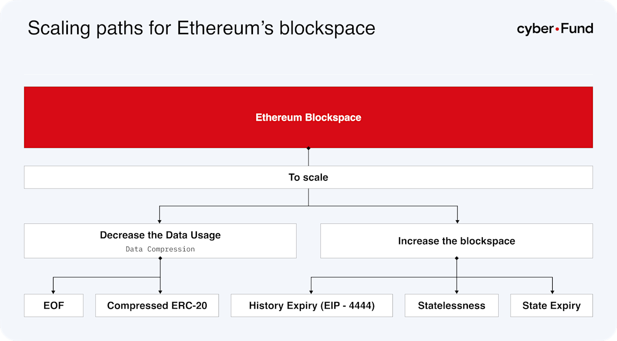 In addition to the state growth, another bottleneck in Ethereum’s growth is the amount of data each block consists of. Currently, an Ethereum block can have a maximum size of 7.15 MB, excluding blobs that can add 0.75 MBs of data on top of that, if a block only consists of data-heavy transactions. The average size of a block, however, is around 100 KB. The current maximum size of a block and blobs becomes problematic when potentially increasing the block size or the number of blobs as certain Ethereum clients have a capability of only handling up to 10 MB of data per block. EIP-7692 (EOF) which will be included in Pectra happening in Q2’25 will solve this problem. It proposes to increase the cost of calldata parameters to limit the number of data-heavy transactions that fit in a block. This would decrease the maximum size of a block to 0.72 MB, excluding blobs, while having little effect on the majority of transactions.