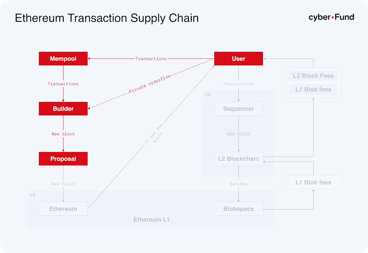 L1 transactions primarily originate from DEX trades and token transfers, including stablecoin and ERC-20 transfers. However, not all transactions are submitted directly to validators. In Ethereum, there are different types of order flow mechanisms. Let’s explore this in more detail.
