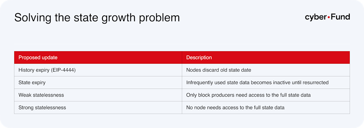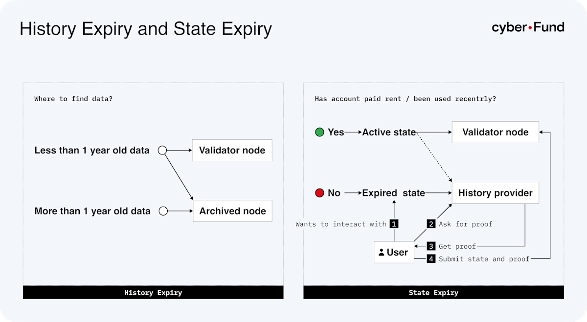 State expiry allows state data that is not frequently used to become inactive. Inactive data can be ignored by full nodes until it is resurrected to become active again. The state could expire in multiple ways such as by rent or time. In expiry by rent model accounts would be charged “rent” and if the balance used to pay rent reaches zero the account would expire. In expiry by time model the accounts would become inactive if they are not interacted with for a certain amount of time. It is important to note that in neither of these expiry models, the inactive state is deleted, it is just stored separately from the active state by a history provider. When someone wants to access an expired state they ask for proof of the historical state from a history provider and submit the proof and their transaction to the network making the state active again.