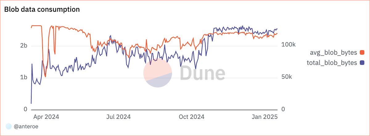 As visualized below the total amount of data posted on blobs has had a positive trend since the launch of blobs. However, the trend has stopped around November 2024. This is due to blobs reaching the target of an average of 3 blobs per slot meaning posting more blobs for an extended period would result in the submitters paying a significant amount of Ethereum for the blobspace. At the same time, the average size of blobs first decreased between the launch of blobs and Q3 2024 after which the average size increased. As the average number of blobs has reached the target of 3 blobs per slot it has become more expensive to post blobs that are not nearly full of data.