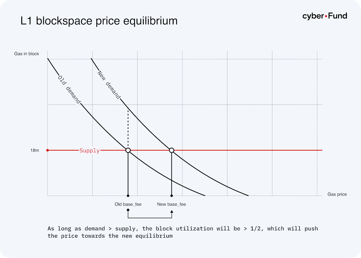As we described above, the gas price fluctuates based on whether blocks have more or less than half of gas utilization, which in turn depends entirely on demand. What follows is that the Ethereum base, if averaged over a long enough time horizon to account for spikes, represents the economic equilibrium, where demand and supply intersect. To illustrate this, suppose that a popular ERC-20 token has been launched, and demand for blockspace increased. This means that the demand curve is shifted to the right, and at the current price level supply is smaller than demand. As long as demand>supply, the block utilization will be >1/2, and the base fee will increase up until the new equilibrium price. A similar dynamic in the opposite direction holds if demand decreases.