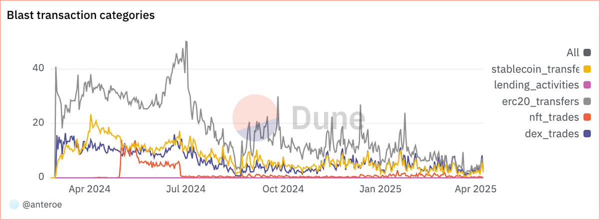 Percentage of all transactions for different transaction categories over time on Blast