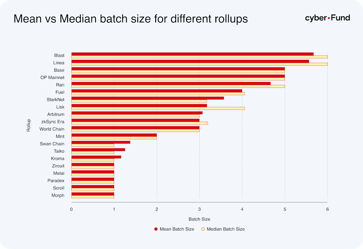 Observing the sizes of posted blobs Blast, Rari, Mint, Fuel, Lisk, StarkNet, Paradex, and zkSync Era post blobs with a median size of over 131 000 bytes in addition to Base, Arbitrum and World Chain. This suggests that these rollups have chosen to minimize the costs of running an L2 by only submitting blobs when they have a full blob worth of data to post. In addition, Linea, Scroll, and Swan Chain post blobs with a median size of over 128 000 bytes. This suggests that these rollups also follow the cost-minimizing strategy when it comes to the posting frequency of their blobs but posts slightly unoptimized blobs in terms of data usage.