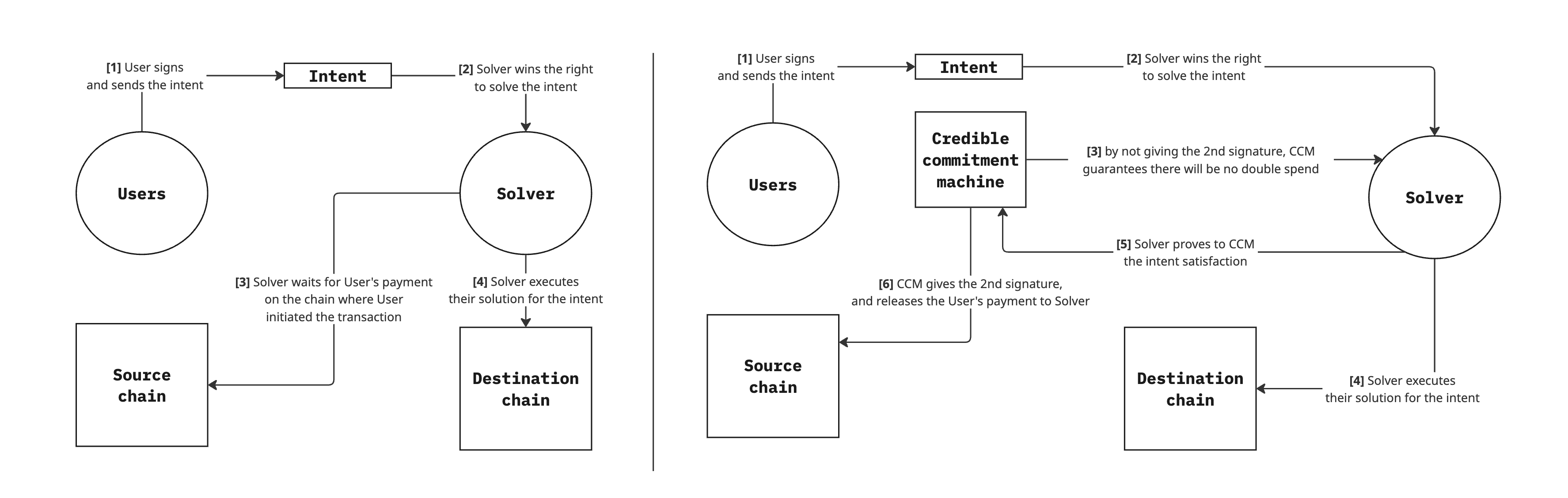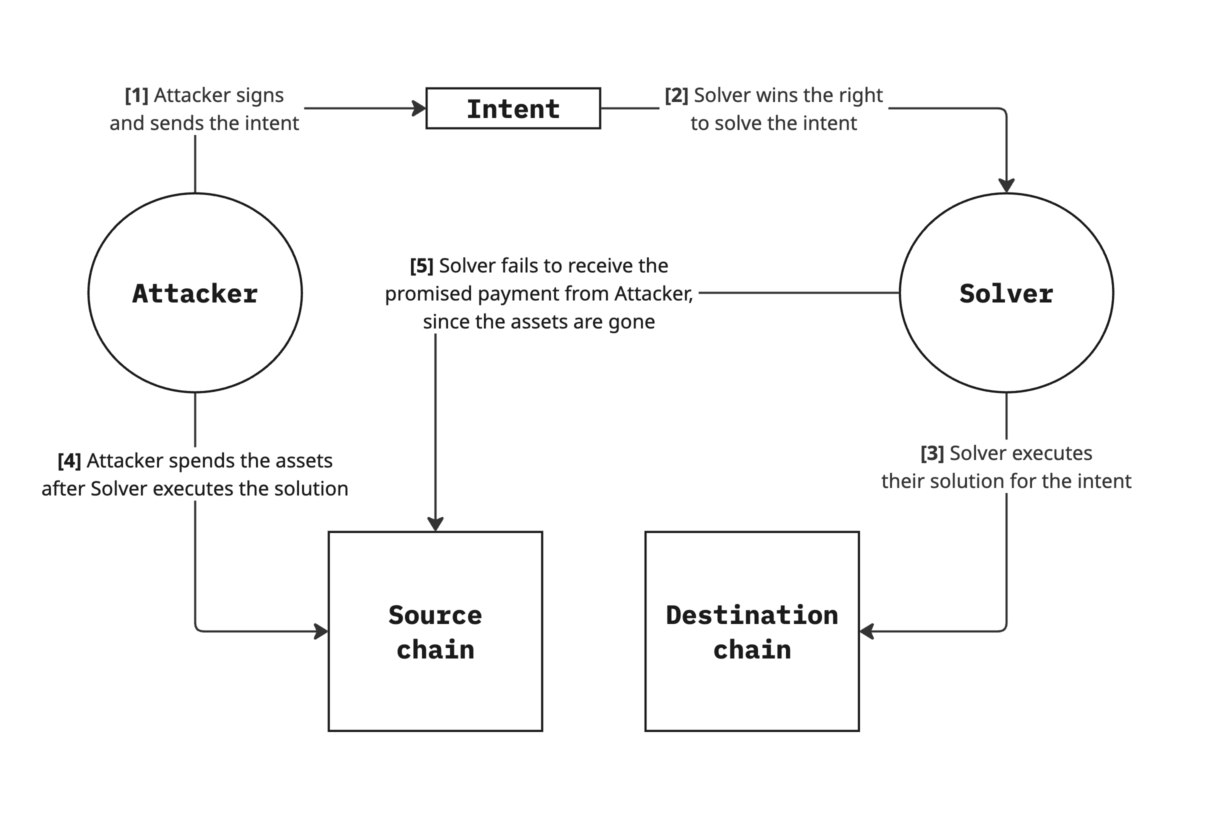 Challenge 1. Double Spend Guarantees. Current intent protocols have a relatively high latency because solvers need to wait for users’ source chain transaction inclusion (or, in some cases, finality) — otherwise a double spend attack can occur, as described below. This is a crucial limitation that prevents current intent solutions from providing synchronous capabilities in their products.