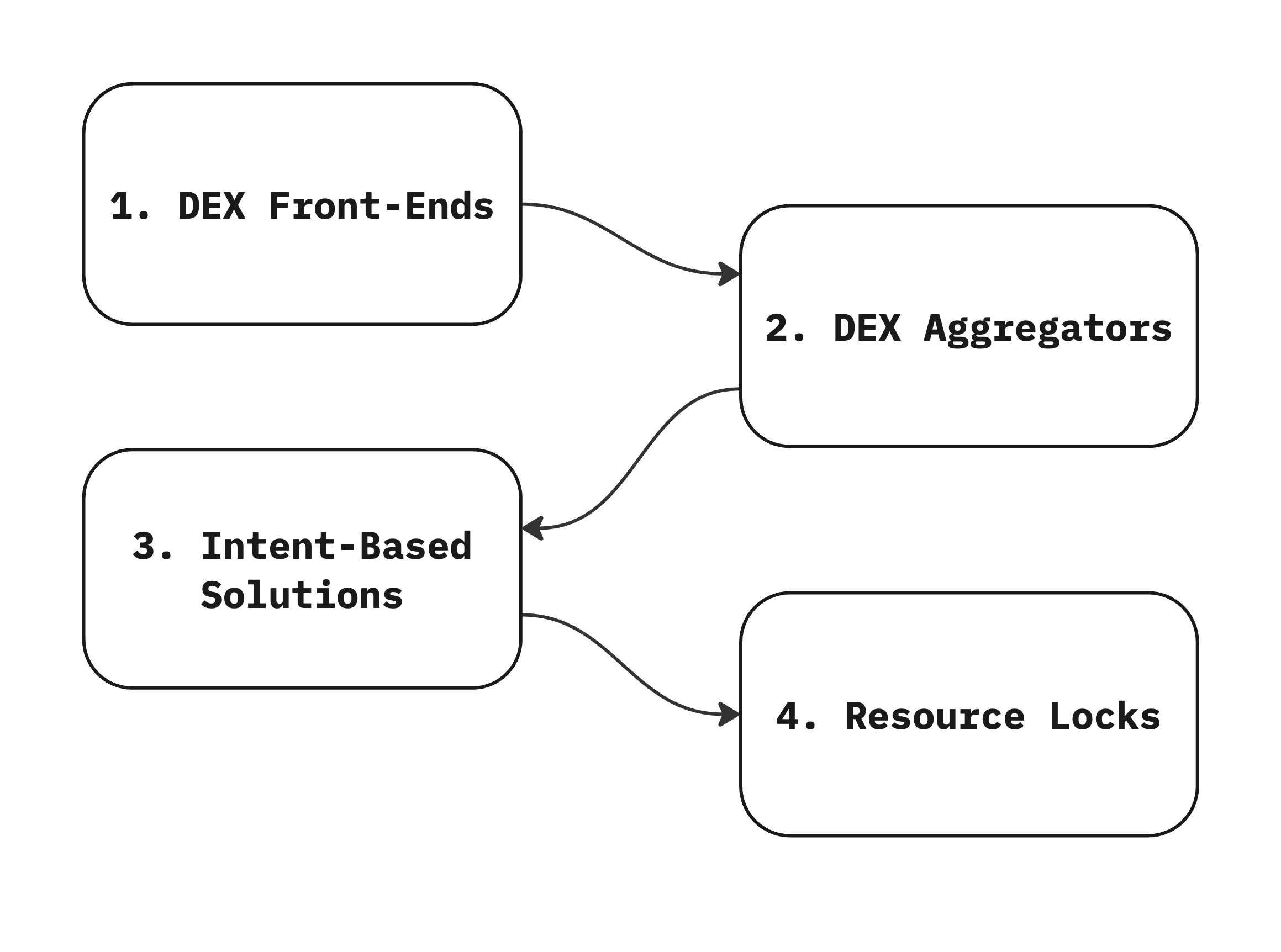 In the early days of DeFi, users interacted with DeFi protocols directly through DEX front-ends. Without aggregators, users had to find & choose DEXs to swap their assets. When aggregators entered the market, they quickly became users' preferred way to interact with blockchains. This rapid adoption made sense—aggregators provided better transaction outputs while eliminating the need for users to search through various liquidity sources themselves. Aggregators were essentially machines that found the best trading paths for users. However, they remained centralized and fell short of creating truly open markets. This limitation paved the way for intent-based architectures.