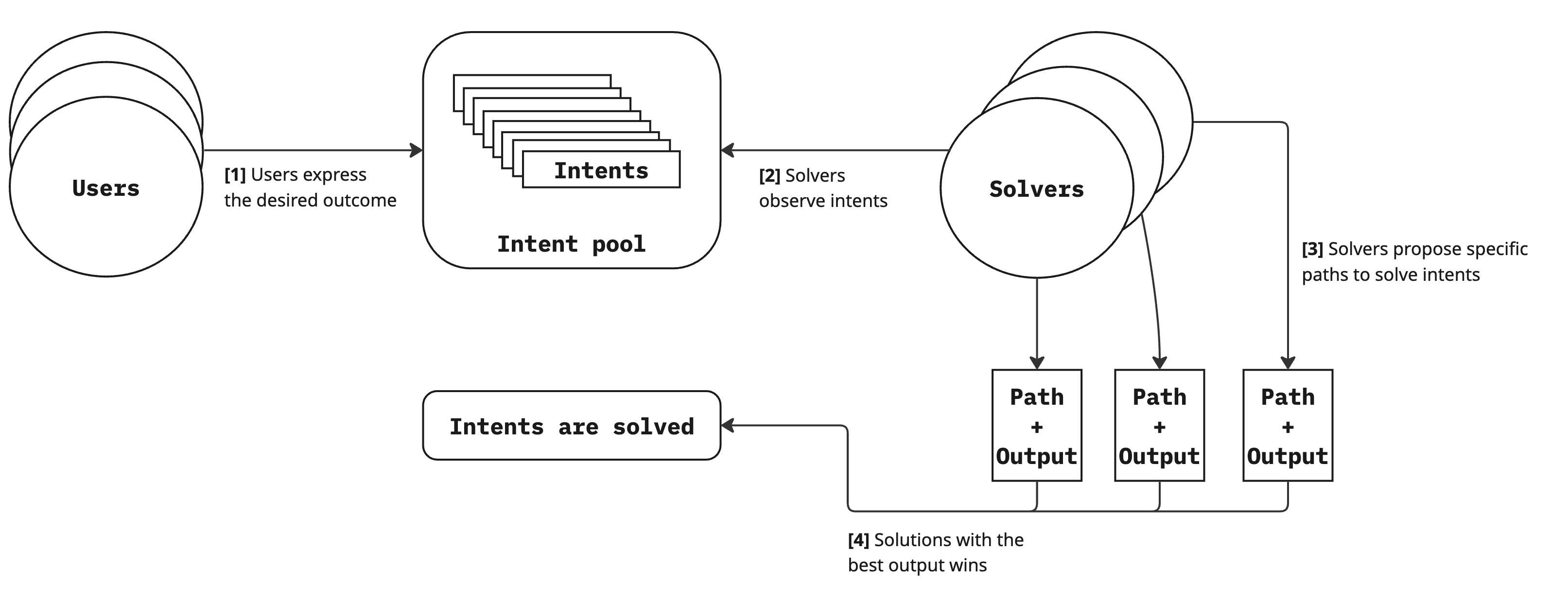 Intents are simple: just like in aggregators, users don’t specify the exact liquidity path through which they want to swap their assets — they simply sign their desired outcome, aka intent. After that external actors called solvers compete to provide users with the best results. Users only need to specify what they want—the protocol handles everything else. As described below, the intent satisfaction path with the best output wins the auction, and the winning solver executes the transactions for the user.