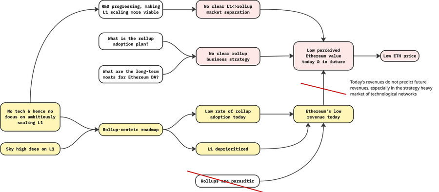 But then, what is the actual problem with Ethereum’s rollup strategy? If the rollup-centric roadmap is correct, and the long-term future of Ethereum is bright, why has the ETH price action has been so bad?