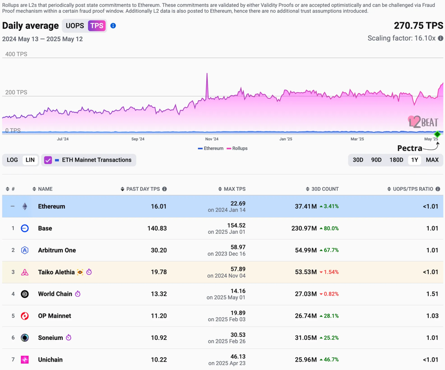 Ethereum DA demand in future. The rollup userbase and TPS are rapidly expanding: Base, for example, recently averages 100 TPS and surging after the Pectra upgrade.