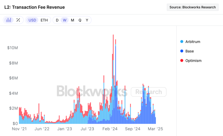 Figure 7: Weekly fees of Arbitrum, Base and Optimisim.