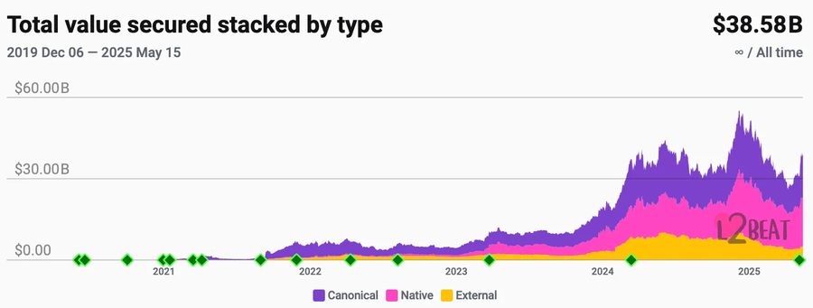 Figure 6b: the aggregate TVL on rollups. Note: recent TVL on Ethereum L1 is $60B.