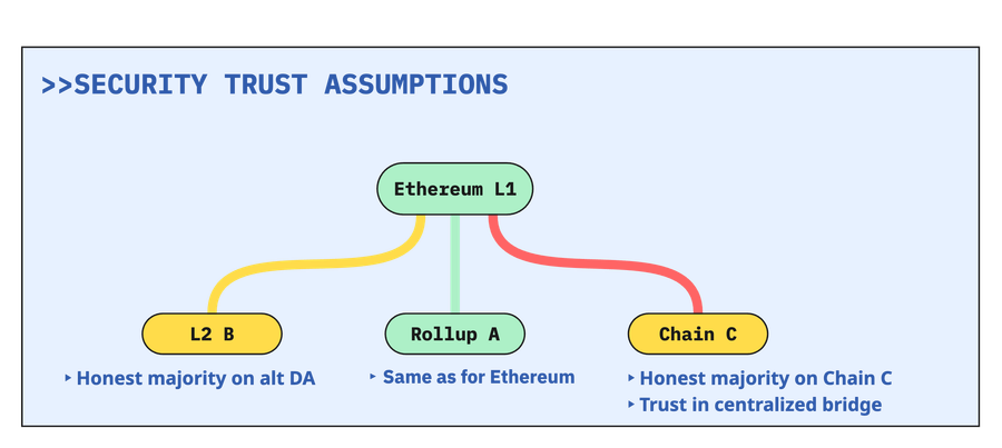 Figure 22: Different trust assumptions for Rollups (use Ethereum for DA & settlement), L2s (use Ethereum for settlement), Chains, and bridges that connect them to Ethereum.