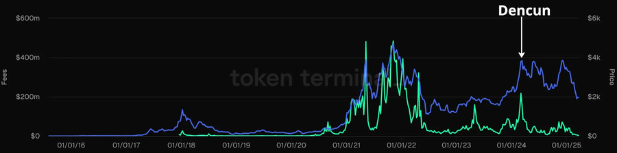 And since 2022, Ethereum networks’ fees (currently primarily coming from blockspace, rather than blobspace) have not increased substantially, both in comparison with Ethereum’s fees in the previous 2018-2022 cycle, as well as in comparison with Solana’s fees this cycle: