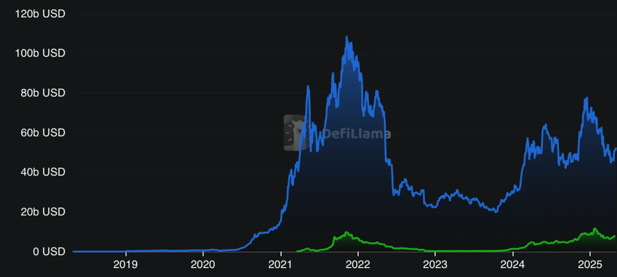 After Ethereum's 2015 launch, the 2016 DAO hack, and the 2017 ICO boom, the 2018–2020 bear market was particularly formative. Ethereum emerged as an ideal execution environment for DeFi: transparent, permissionless, self-custodial and highly interoperable financial infrastructure. DeFi unlocked token issuance via the ERC20 standard, trading via Uniswap, decentralized stablecoins like DAI from Maker, and lending via money markets like AAVE & Compound. After the legendary 2020 DeFi summer, the PMF was undeniable — see the blue TVL graph below.