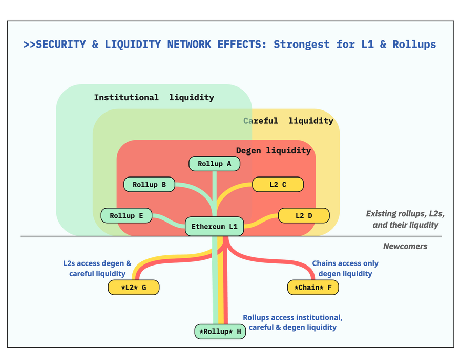 Interestingly, the key amplifying factor behind the liquidity network effects is the security of Ethereum DA and rollups’ validating bridges. The recent bright idea of native rollups reinforces execution guarantees and rollup security, hence bolstering both trust and liquidity network effects. These rock solid security assurances are the core underlying reasons for why businesses & institutions will continue to gravitate towards building on Ethereum.