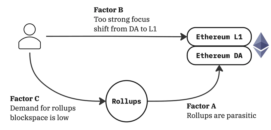 Factor B. Too strong of a shift of focus from L1 to DA. Post-rollups, Ethereum’s strategy and user growth has been focused on rollups, neglecting the growth and maintenance of L1.