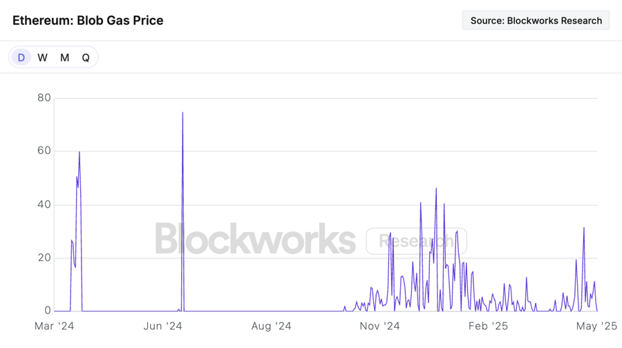 Figure 10: Daily average blob gas price in gwei, i.e. the cost to store bytes on Ethereum DA
