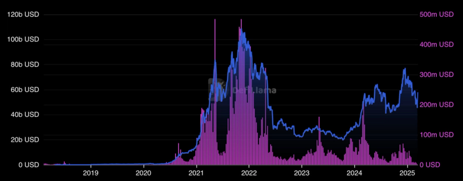 Figure 2: Ethereum TVL in blue, weekly fees in pink