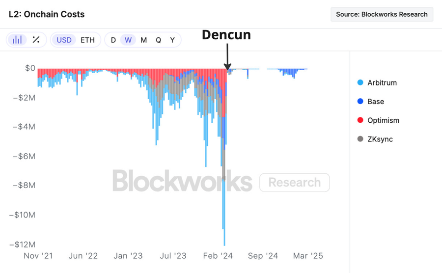 Figure 8: Rollups’ onchain costs, and their drop post-Dencun