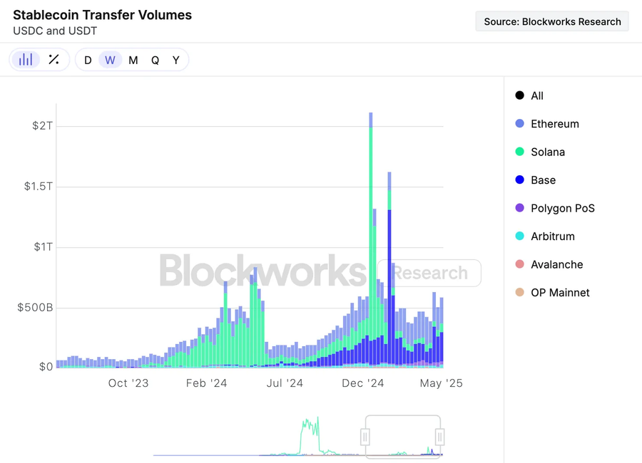 In practice, Base (Coinbase’s rollup processing over >40% of weekly $0.5T onchain stablecoin volume — see Figure 18 below), World Chain (Worldcoin’s rollup serving over 10 million unique humans), Arbitrum ($13B TVL rollup with an active grassroots DeFi ecosystem), Optimism, Unichain, Starknet, zkSync, Linea, Scroll, Taiko, Soneium (Sony’s rollup), Ink (Kraken’s rollup) and many others are becoming great channel partners, helping Ethereum onboard users and expand the blockspace market.
