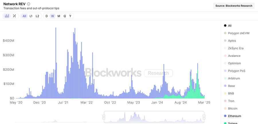 Ethereum vs Solana. Based on the fee earned in 2024, some may say that Solana has started outcompeting Ethereum in the blockspace market. However, Solana’s hardware-focused scaling strategy is much riskier, and the network shows signs of oversaturation periodically. If blockchains live up to to their full potential—i.e. the whole financial infrastructure largely moves onchain—Solana will need to pivot to the sharding scaling strategy, whereas Ethereum’s security, rollup infrastructure & adoption will be already way ahead.