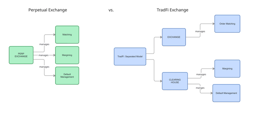 An important distinction from TradFi, which separates the exchange from the clearing house, is that a perp venue vertically integrates both. Matching, margining, liquidations, and default management all live inside one unified system.