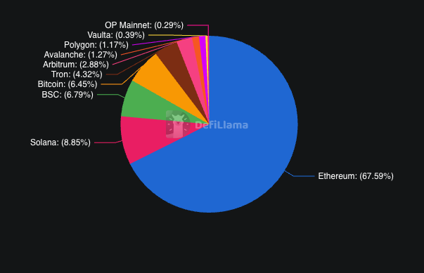 The most effective form of composability is to coexist natively with an existing deeply liquid DeFi ecosystem. Jupiter exemplifies this on Solana. Because it lives directly on the L1, the JLP token can be leveraged as collateral in lending markets. However, while powerful, this is only as strong as the degree of DeFi activity of the underlying chain. Solana’s DeFi ecosystem, while growing, is still significantly smaller than Ethereum’s. With close to 70 billion usd in DeFi TVL, Ethereum powers around 70% of all blockchain’s DeFI TVL combined.