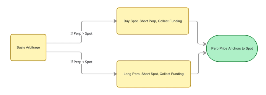 Basis arbitrage ties the perp to the underlying. When the perp price trades above spot, one can capture the funding payments by buying spot and shorting the perp. In the opposite case, where spot trades above the perp price, one can capture funding payments by going long the perp and short spot.