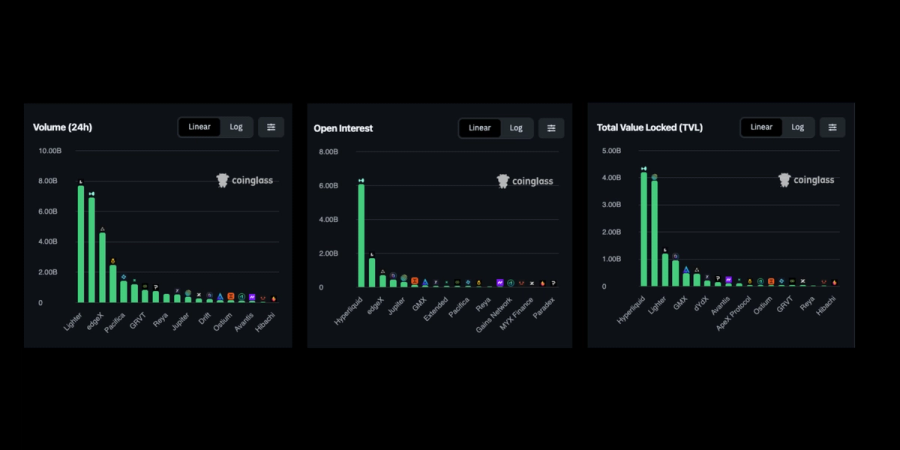 On the decentralized front Lighter currently edges out Hyperliquid on raw volume while Hyperliquid maintains a decisive lead on open interest, sitting at around 6 billion dollars versus roughly 2 billion dollars for Lighter at the time of writing.