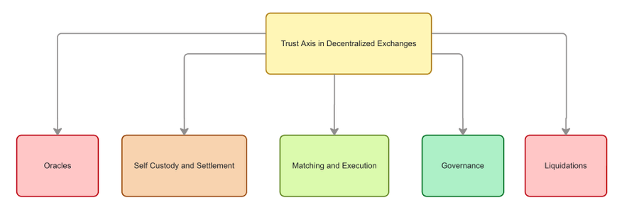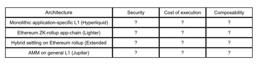 In the next section, we deconstruct each venue’s architecture and the guarantees it provides across the five critical dimensions defined earlier: self custody and settlement, matching and execution, liquidations, oracle inputs and governance. Note that while we provide an overview of each exchange today, the main takeaway of this analysis should be whether a chosen architecture fundamentally limits an exchange's ability to compete on security, scale, and composability in the long run. After covering each design the goal is to evaluate each exchange on its structural potential on the scorecard below.