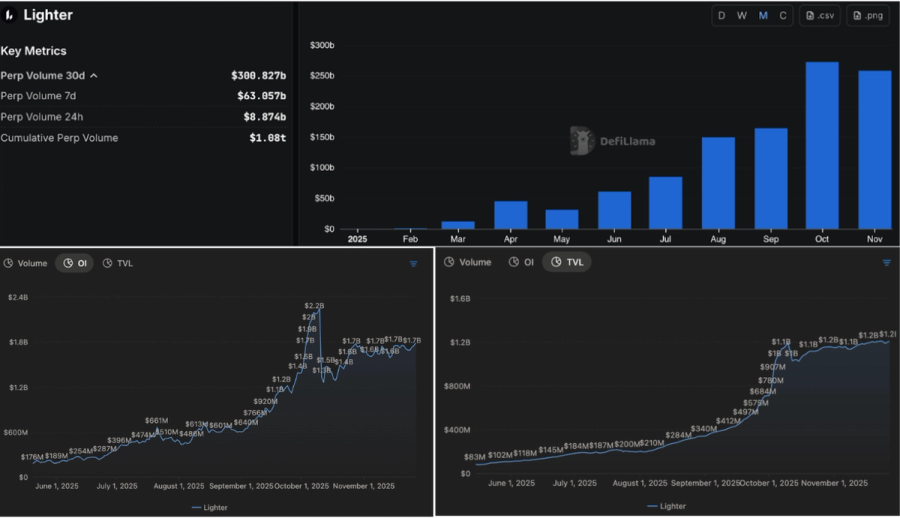 Today Lighter stands as the largest perp DEX by monthly volume at around 300 billion. It is the second largest by TVL at roughly 1.2 billion and by OI at around 1.7 billion. What stands out is the high ratio of volume to OI. Lighter sits at roughly 180x while Hyperliquid is closer to 42x. One reason for this may be the revenue model that Lighter chose. Instead of charging taker fees and paying maker rebates like most venues, Lighter introduced a two tier account system. Traders on the free tier face a small speed lag relative to paying accounts but enjoy zero fee trading. This naturally attracted a large wave of taker scalping activity that benefits from a zero fee environment. Scalping works by opening and closing positions within very short time windows to capture small price movements. It contributes almost nothing to OI, yet heavily boosts volume.