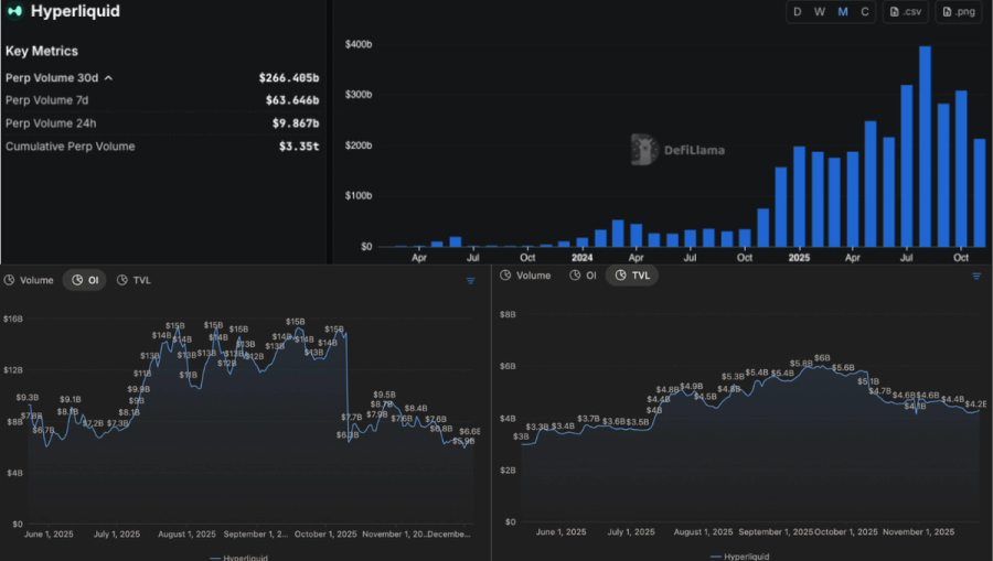 Combined with the high performance CEX-like UX, this has translated into sticky use. Weekly active users sit around 150k. Open interest is roughly 6.4 billion dollars, TVL about 4.2 billion dollars, and 30 day volume near 270 billion dollars. High OI and TVL together with sustained volume point to significant organic usage.