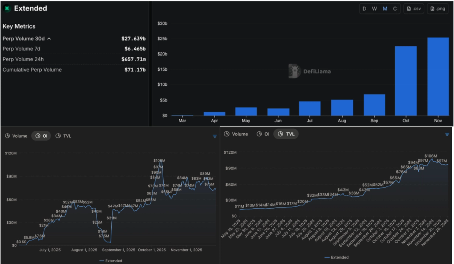 On the commercial front Extended has been growing quickly since its migration in August. While smaller than Hyperliquid or Lighter it has found traction ranking roughly ninth by monthly volume at about 27 billion dollars, with open interest around 75 million dollars and TVL near 95 million dollars..