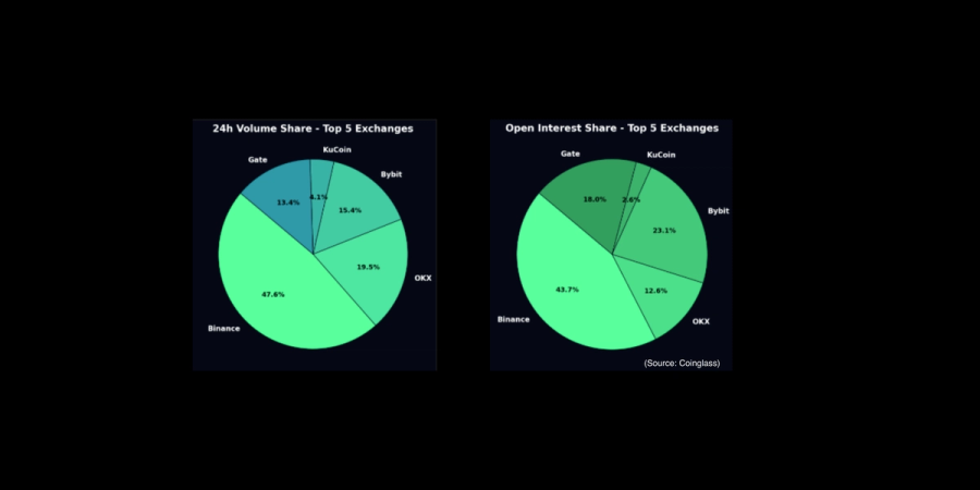 The trend however speaks for itself. Over the last twelve months DEX market share has surged from roughly 5 percent to about 20 percent marking a 300 percent increase in relative dominance. On the centralized side five venues effectively control the field according to data that is reported. Binance accounts for roughly half of the top five volume and open interest followed by OKX, Bybit, Gate and KuCoin.