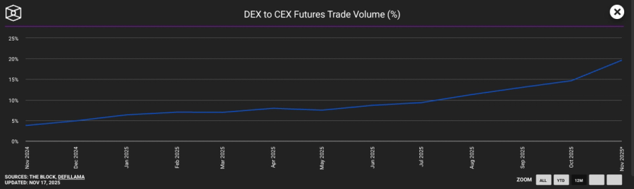 Perp trading is still dominated by centralized exchanges. While decentralized exchange volume reached approximately 1.2 trillion dollars in October 2025 centralized venues processed roughly 8 trillion dollars in that same period. Today about 80 percent of total volume still runs through CEXs with DEXs capturing the remaining 20 percent.