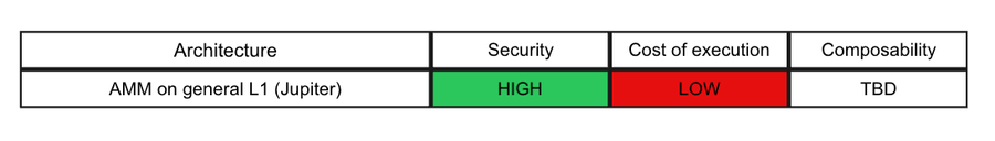 The market is massive and competition is fierce. To assess which architecture will likely dominate and scale to serve this demand, we make the assumption that the end user or the downstream integrator, such as a wallet or a fintech, are rational in their choice and aim to optimize some kind of utility function. This function is weighted to some degree across three factors: the cost of execution, security, and composability. Below are some theoretical values for visualization purposes.