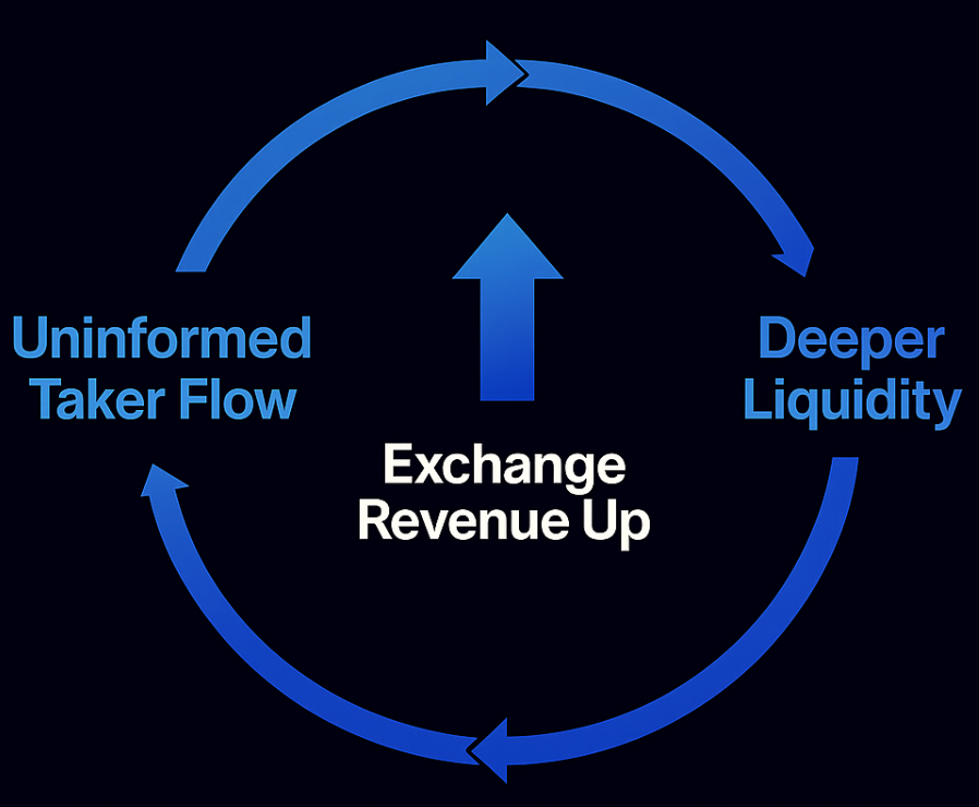 We view the sustainable value of an exchange as a function of its ability to attract uninformed flow. This refers to taker flow that is not driven by superior short-term price information. Think hedgers, asset allocators or retail users. This contrasts with toxic flow from high-frequency arbitrage bots, which typically results in losses for the market maker.