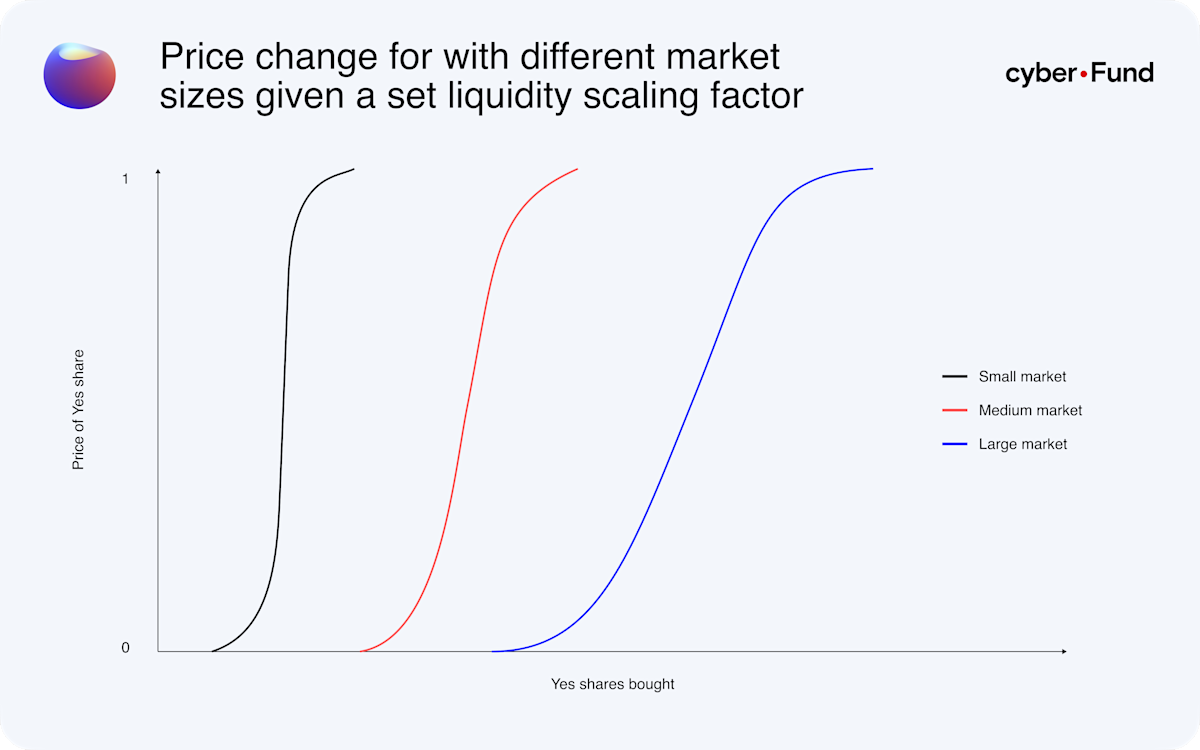 The main benefit of LS-LMSR is that contrary to using an order book it enables anyone to launch a market with minimal seed liquidity and multiple possible outcomes. Initially the algorithm has a high price sensitivity and updates odds in larger intervals for a given trade size. This volatility is by design – it incentivizes traders to move early and place bets before the market attracts more attention, offering an attractive upside. On the other hand, once the market gains traction, the algorithm automatically reduces price sensitivity and hence allows even large-sized orders without massively impacting the odds.