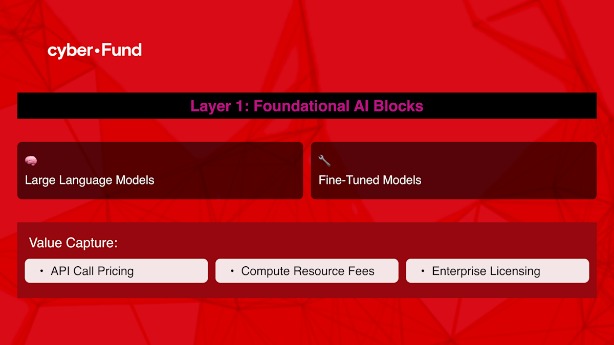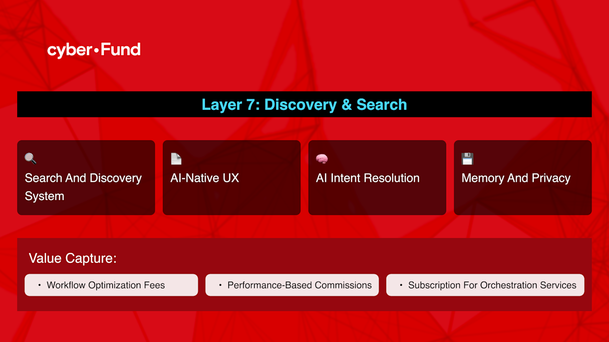 Cybernetic agent economy relies on a stack of interconnected technological layers. For each layer, let's take a look at the value capture mechanisms and business models that are emerging in this new landscape.