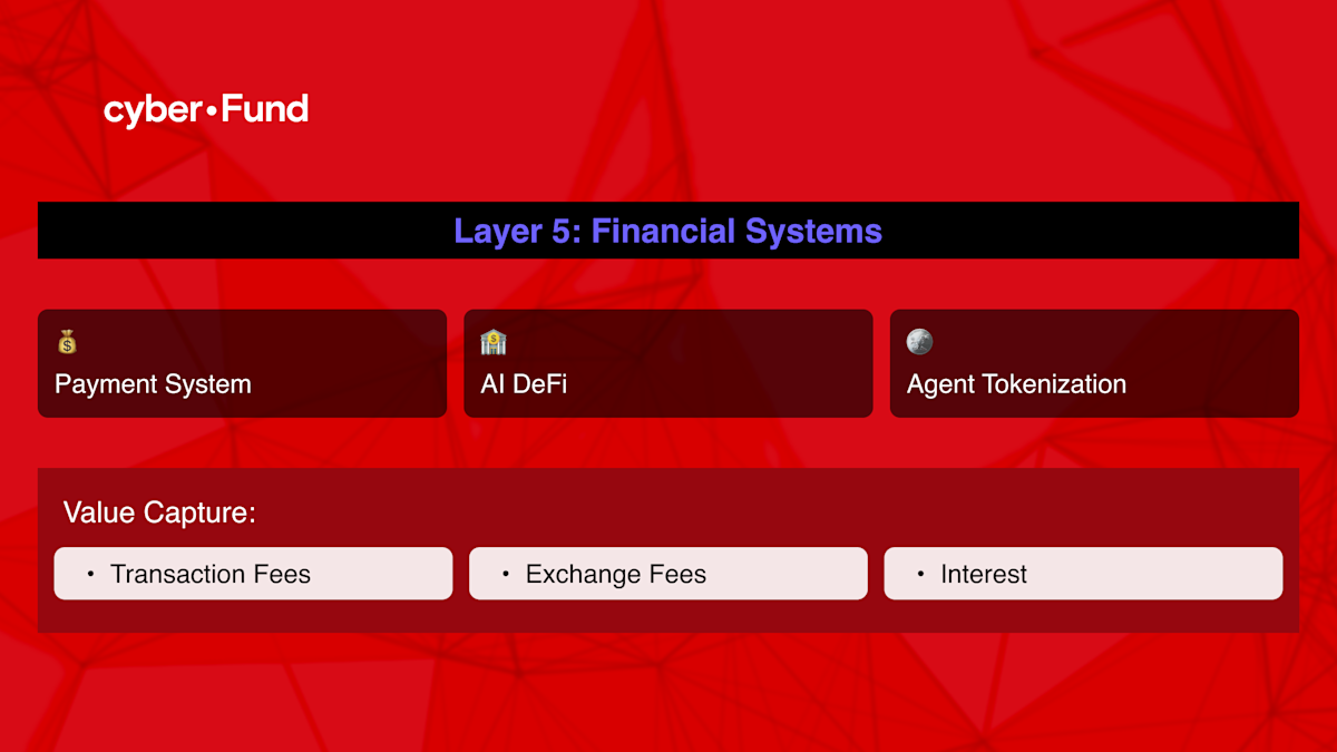 AI DeFi: Agent-centric financial services like lending (using future agent revenue streams as collateral), borrowing, insurance, and investment products (e.g., ETFs of agent revenue tokens).