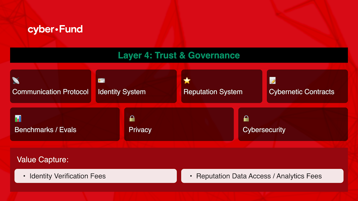 Value Capture: Direct monetization is less clear, but this layer is foundational for enabling value capture elsewhere. Providers of robust identity, reputation, or security solutions will be critical. Insurance markets specific to AI risks will likely emerge, driving demand (and creating value) for verifiable trust and safety features.