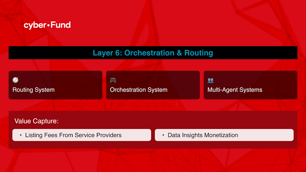 This layer adds value by efficiently managing complexity. For example, planning a complex trip might involve an orchestrator coordinating separate agents specializing in finding attractions, booking flights based on calendar availability, checking visa requirements, and arranging local transport, charging a fee for the successful execution of the multi-agent workflow.