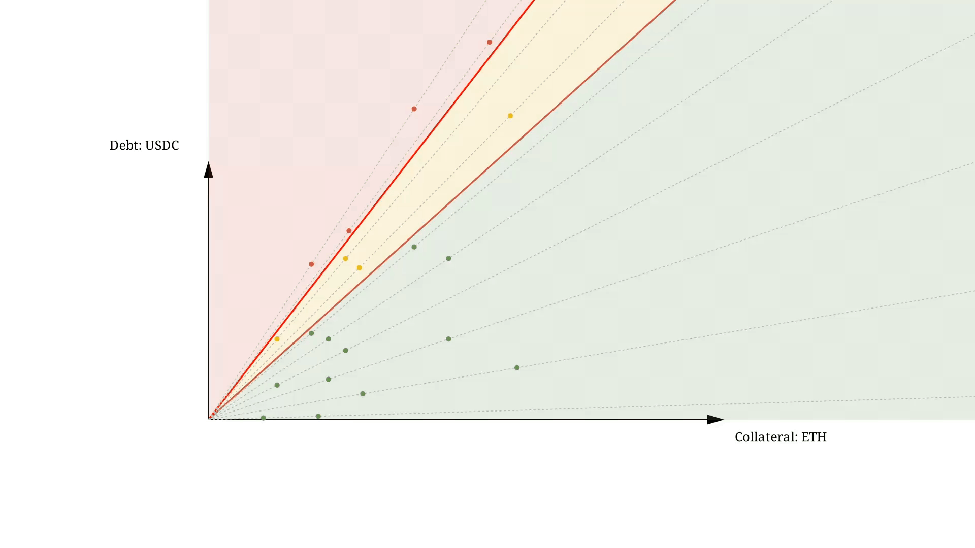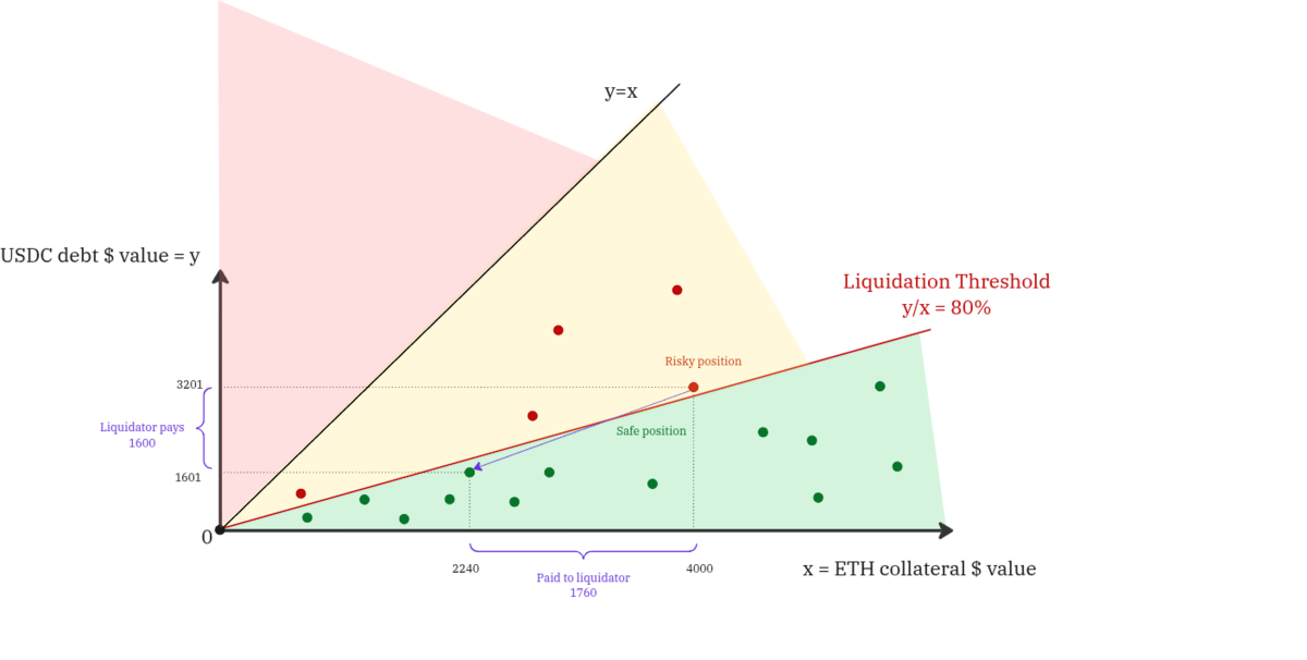 The green dots represent safe positions and the red ones represent risky, liquidatable position. Position is liquidatable if it’s debt ÷ collateral ratio is bigger than a certain specific threshold. Over time this ratio is changing as prices of debt and collateral assets are fluctuating. For example, for specific position, if the debt price stayed the same, but the collateral has dropped, it will shift position to the left on the graphic. A universal goal of any lending protocol is to keep positions in the green safe zone, and if they move to the yellow liquidatable zone, move them to the green zone with the help of liquidations.