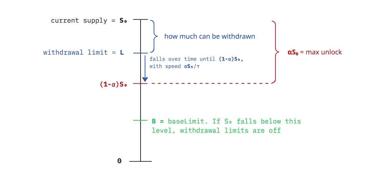 After each withdrawal S₀ ~> S₁: max unlock changes αS₀ ~> αS₁ if S₁<B, then L=0, i.e. withdrawal limit restriction is canceled