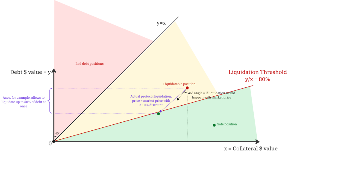 The protocol’s main priority is to prevent positions from shifting into the red bad debt zone. If a position moves there, it means the borrower's debt became bad, which means that the value of debt is bigger then the value of borrower's collateral.