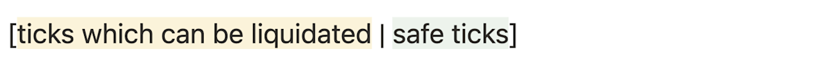 If the liquidator is out of debt assets to repay and the liquidation threshold tick is not met, the process will be stopped at the last tick which was reached in the loop. The subtle complication arises when the liquidator runs out of money at the moment when position is between two ticks. In this situation, partially liquidated ticks occur (pink dots on the image), which represent ticks stopped somewhere in between ticks. When another liquidator comes to liquidate, the process will continue from the position where the previous liquidator stopped (or from a higher tick if it appeared during the time that passed between the two liquidations) and will keep going until all positions are in the safe zone.