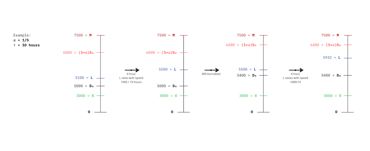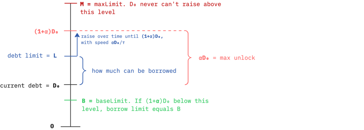 After each borrow D₀ ~> D₁: max unlock changes αD₀ ~> αD₁ if D₁<B, then L=B, i.e. minimal borrow limit